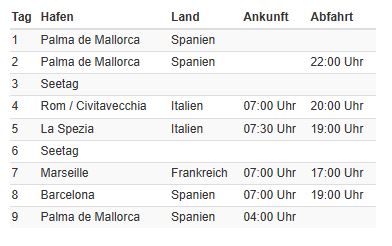 | Termine | Sonderpreis Balkonkabine ab/an Hafen | |