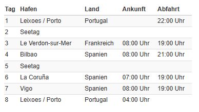 | Termine | Sonderpreis Balkonkabine ab/an Hafen | |